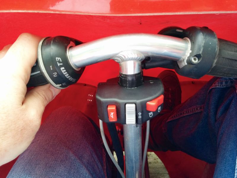 Kap schroeven (Moet eigenlijk gelamineerd maar is dan niet meer los te halen. Nu: schroeven los, en je kunt overal bij) Nieuwe spiegels, voorlamp en alle knoppen aan het stuur (hoort eigenlijk op een motorfiets, maar dit kan best :-))