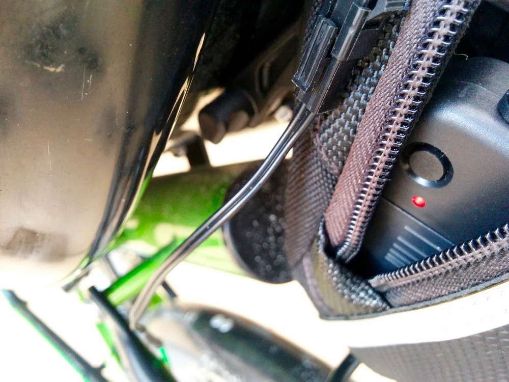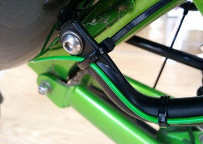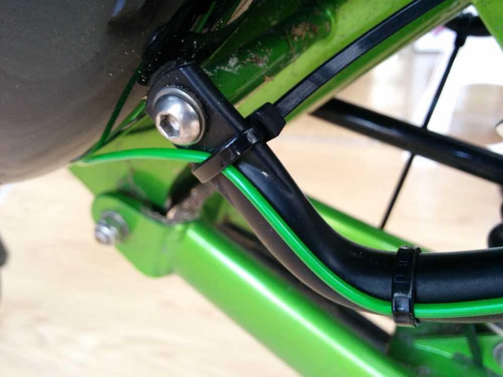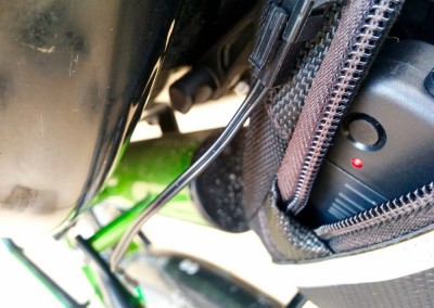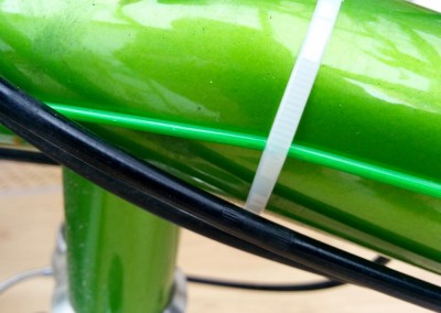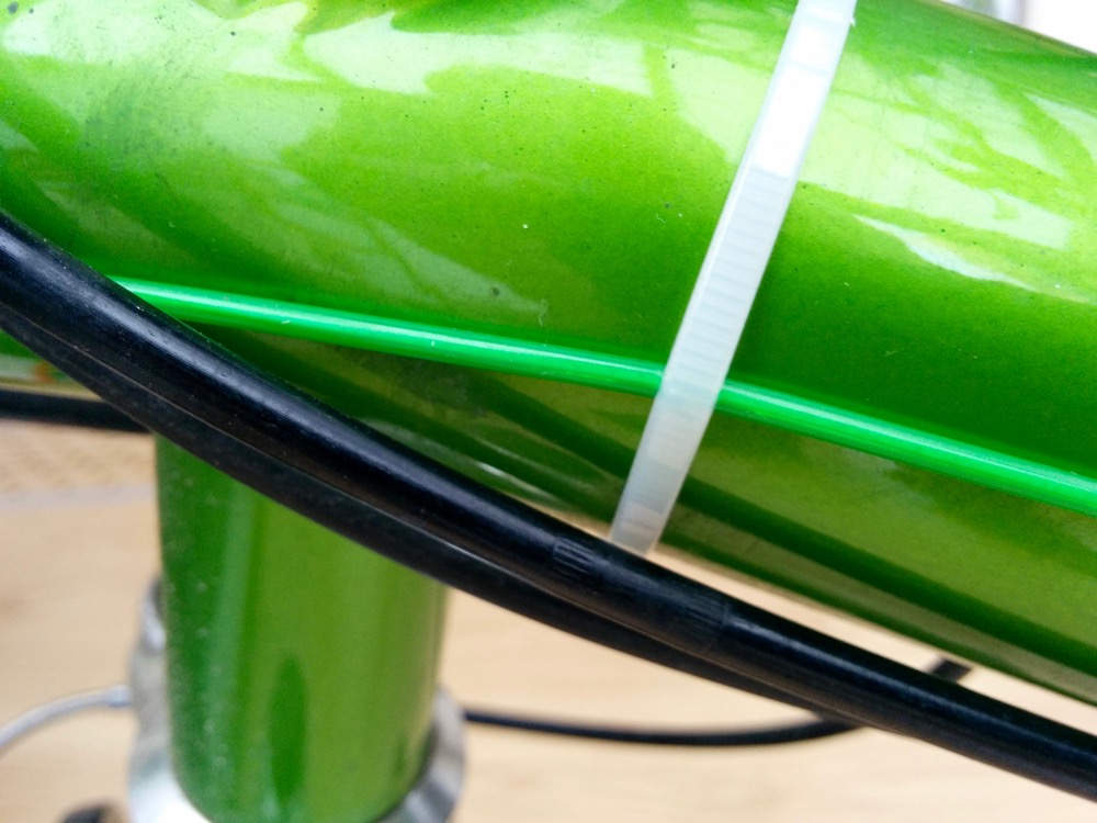 Tasje voor batterijhouder onder het zadel, lijn bedenken, voorlopige bevestiging van de draad met tie-wraps om eens te kijken hoe dat houdt en hoe dat er uit ziet. Niet te strakke bochtjes natuurlijk.